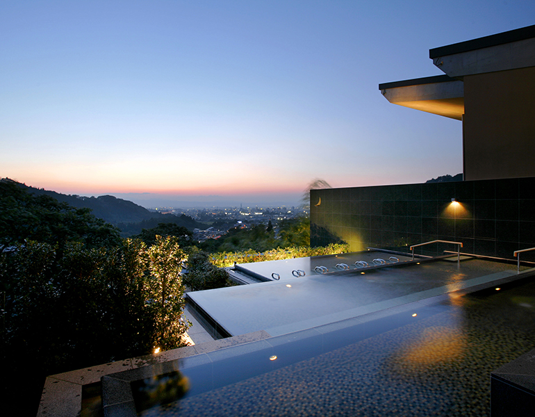 杉乃井ホテルで楽しめるのは、別府の景色を一望できる大展望露天風呂「棚湯」です。湯船を5段もの棚田状に広げた大展望露天風呂からは、別府湾や別府の町並みを一望できるほか、晴れた日には四国佐田岬まで見通すことができます。