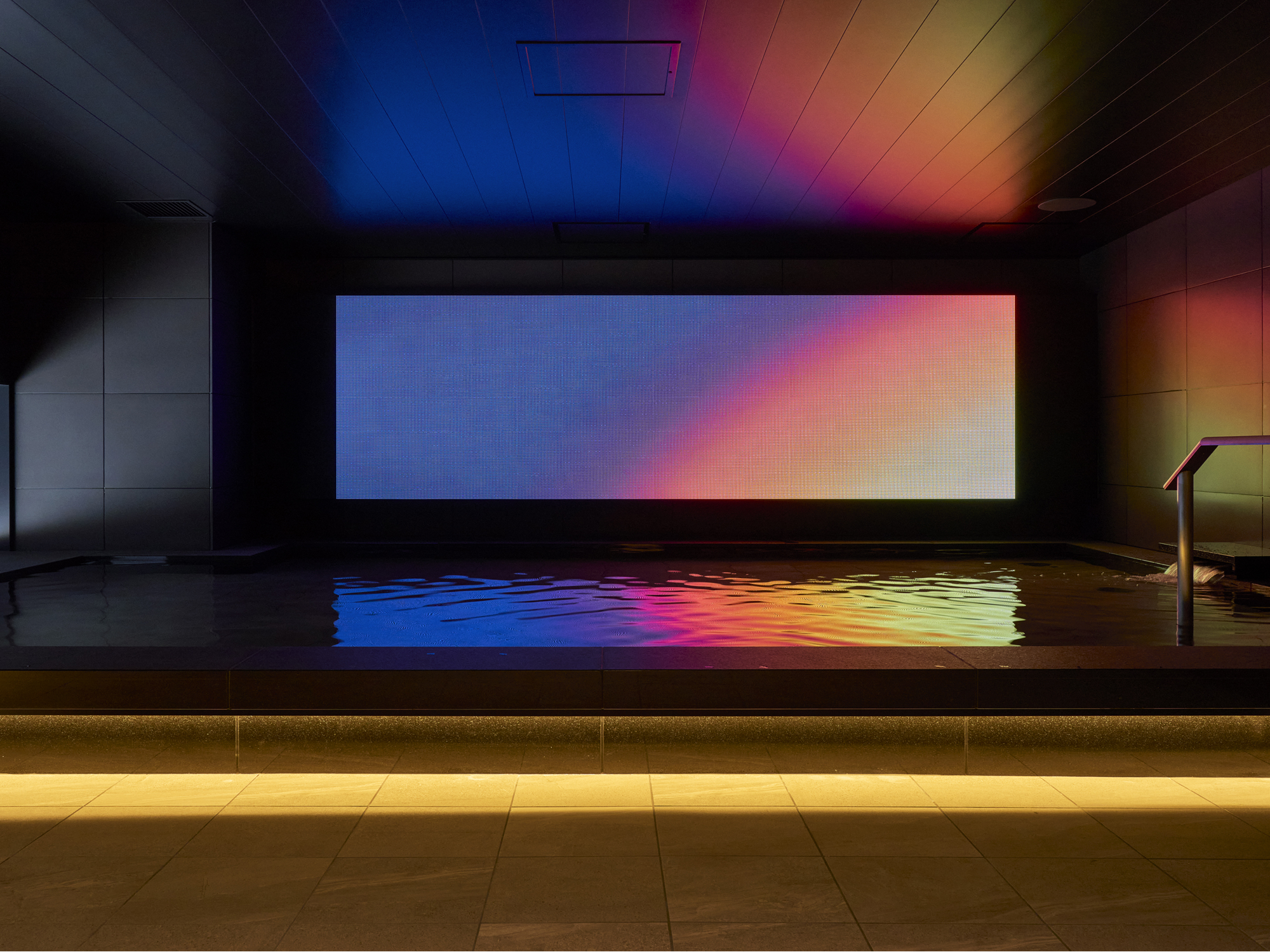 そしてサウナと共に楽しめるのが、大浴場。こちらではその土地を感じる「SENSE OF LOCAL(センス オブ ローカル)」、印象的な一瞬を感じる「アイコニックモチーフ」、予定不調和の刺激を感じる「化学反応」をコンセプトに、デジタルアートとBGMが流れる新感覚の温浴体験を楽しむことができます。幻想的な大浴場やサウナは、まさにアートを取り入れたホテルのコンセプトを体現するような空間です。