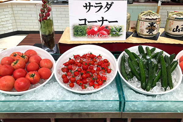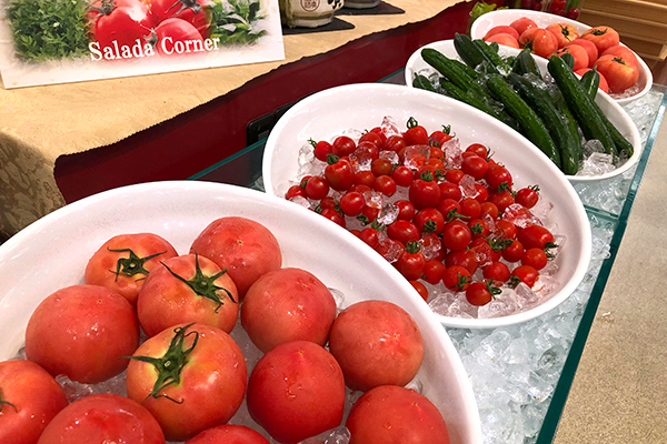 直売所「まんま〜じゃ」では、その日残った一部の新鮮野菜を、翌日にビュッフェレストラン「あがらんしょ」にて、会津産「まるごと新鮮野菜」としてご提供します。生産者の方々が丹精込めて栽培した夏野菜をまるごと味わっていただきたく、新鮮でみずみずしい夏野菜(トマト、ミニトマト、きゅうり)のまるかじりを、豊富な夏メニューと一緒にお楽しみいただけます。