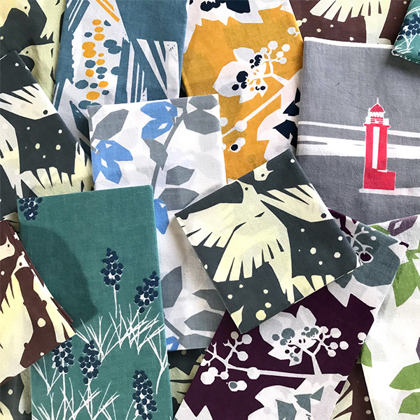 小樽の鳥「あおばと」の目に映る北海道の情景を想いオリジナルデザインでシルクスクリーン手捺染による布作品を制作しています。