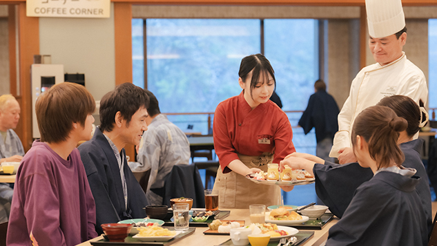 北陸・富⼭ならではの新鮮で多彩な⾷材をビュッフェ形式でご提供。レストラン中央には、シンボリックな円柱⽔槽が設置され、富山湾で採れる魚をご覧いただけます。ライブ調理はもちろん、ORIX HOTELS & RESORTSのコーポレートエグゼクティブペストリーシェフ鈴木一夫が考案したオリジナルレシピのプリンは、地元の牛乳をふんだんに使用。ここでしか味わえない特別な一品をお楽しみいただけます。