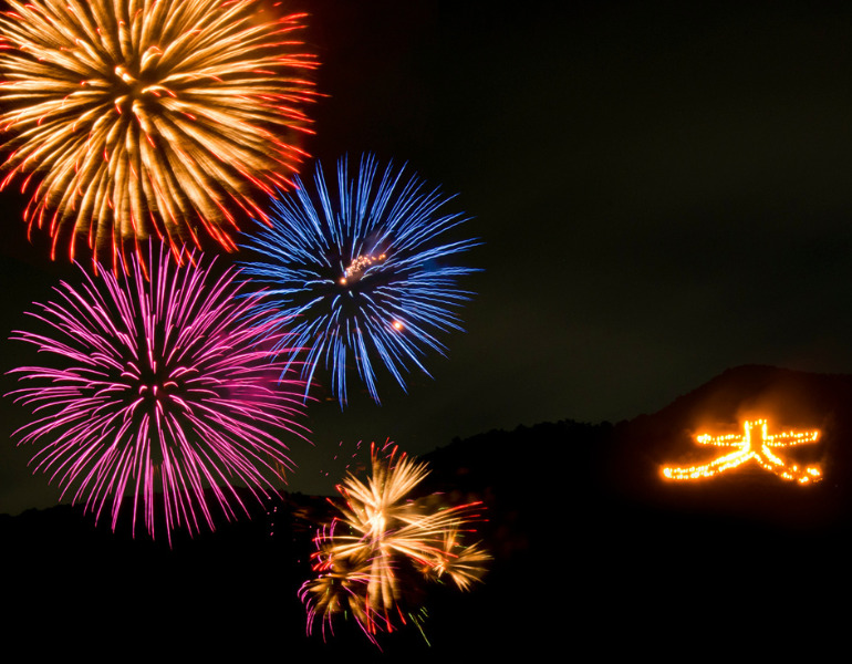 見どころはなんと言っても、大文字焼と花火の競演です。花火の数は約2,000発。明星ヶ岳で「大」の字が燃え上がると同時に、色とりどりの仕掛け花火やスターマインが花開き、「大」の字の下には迫力あるナイヤガラが現れます。19時30分に打ち上げ開始します。
