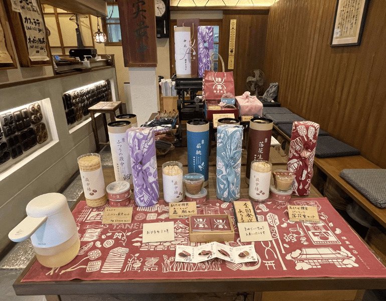 店内はレトロさを感じられるインテリアや小物、最中の型がおしゃれに飾られていて、見ているだけで楽しい空間。イートインスペースもあり、京都散策の休憩に訪れる方も多いそうです。店頭限定で販売されてる「あいす最中」は、濃厚なアイスクリームと種嘉こだわりのあんこ、求肥を一緒に挟んだ、夏にぴったりの商品です。