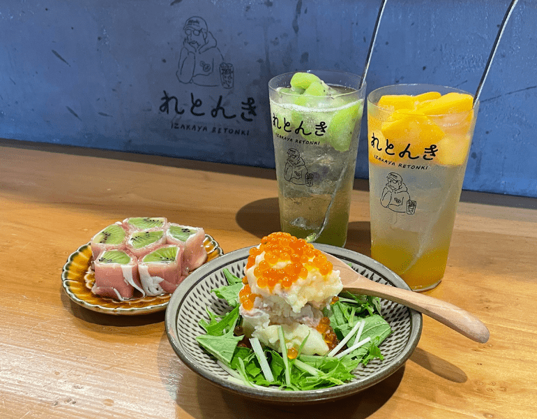 『れとんき』はお酒の種類も幅広く揃えていますが、中でもおすすめは「れとんきフルーツサワー」。マンゴーやキウイ、ストロベリーやパイナップルなど、計6種類のラインナップがあります。サワーには大きくカットされたフルーツがゴロゴロと入っており、飲みごたえばっちり!グラスのロゴと色鮮やかなフルーツは、思わず写真に収めたくなること間違いなし。