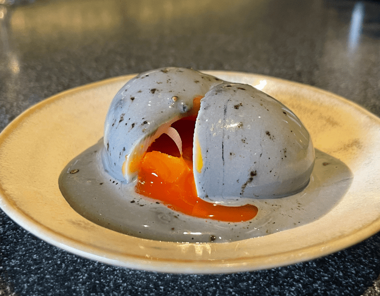 『charbon』に訪れたらまず最初に味わいたいのが「半熟玉子と自家製マヨ」です。半熟玉子の上に炭パウダー入りのマヨネーズがかかっている『charbon』ならではのメニュー。