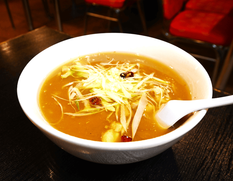 おすすめは、龍門名物「鶏肉の葱油かけそば」。とろみのあるあんかけスープは、ピリッとした辛味にニンニクが効き、ストレートな細麺にしっかり絡みます。後からじんわり広がる辛さがクセになり、何度でも味わいたくなる1杯です。