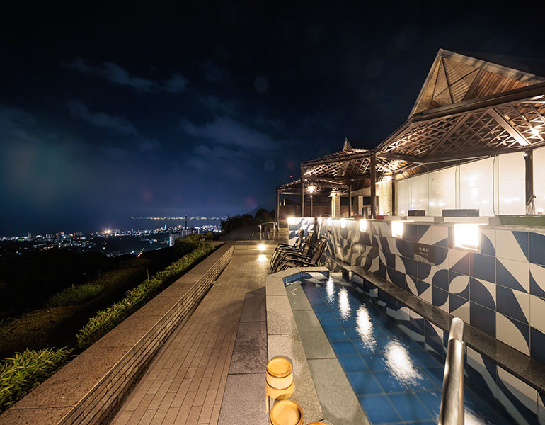 杉乃井ホテルで楽しめるのは、別府の景色を一望できる大展望露天風呂「棚湯」です。湯船を5段もの棚田状に広げた大展望露天風呂からは、別府湾や別府の町並みを一望できるほか、晴れた日には四国佐田岬まで見通すことができます。